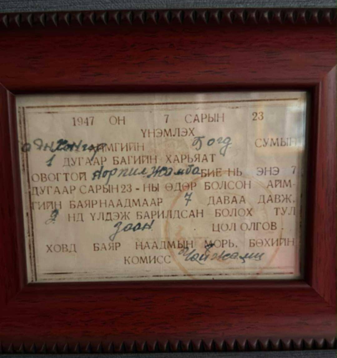 1947 оны 07 сарын 23 өдөр Ховд аймгийн наадамд 7 давж заан цол авав.